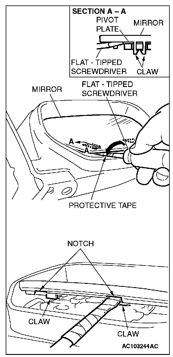Slant the mirror upward with your hands. Then insert a flat-tipped screwdriver wrapped with protective tape between the pivot plate and mirror through the notch from behind the mirror. Now pry off the mirror claws and remove the mirror as shown.