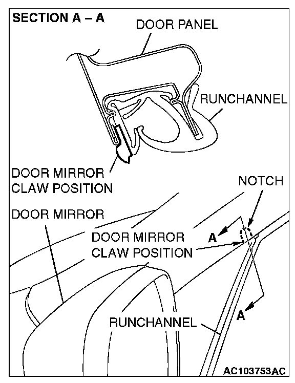 CAUTION: When assembling the door mirror, check to see that the claws of the door mirror are inserted into the notch of the front door runchannel.
