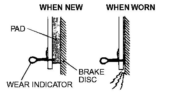 DISC BRAKE PAD CHECK AND REPLACEMENTNOTE: The brake pads have indicators that contact the brake disc when the brake pad thickness becomes 2 mm (0.08 inch), and emit a squealing sound to warn the driver.