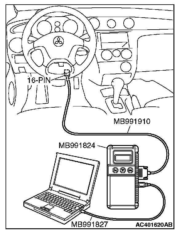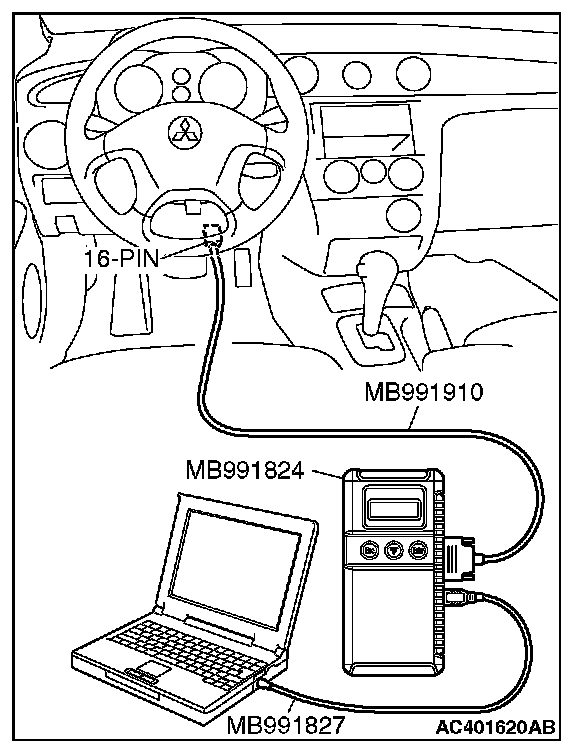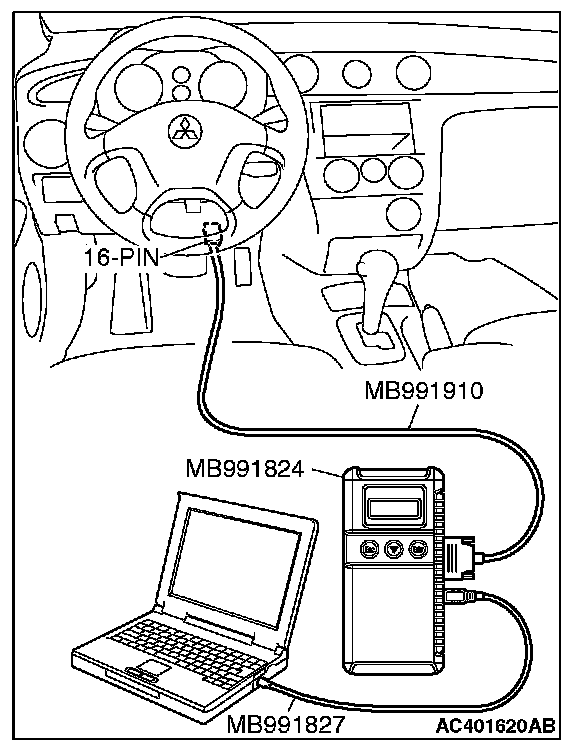 CAUTION: To prevent damage to scan tool MB991958, always turn the ignition switch to the "LOCK" (OFF) position before connecting or disconnecting scan tool MB991958.