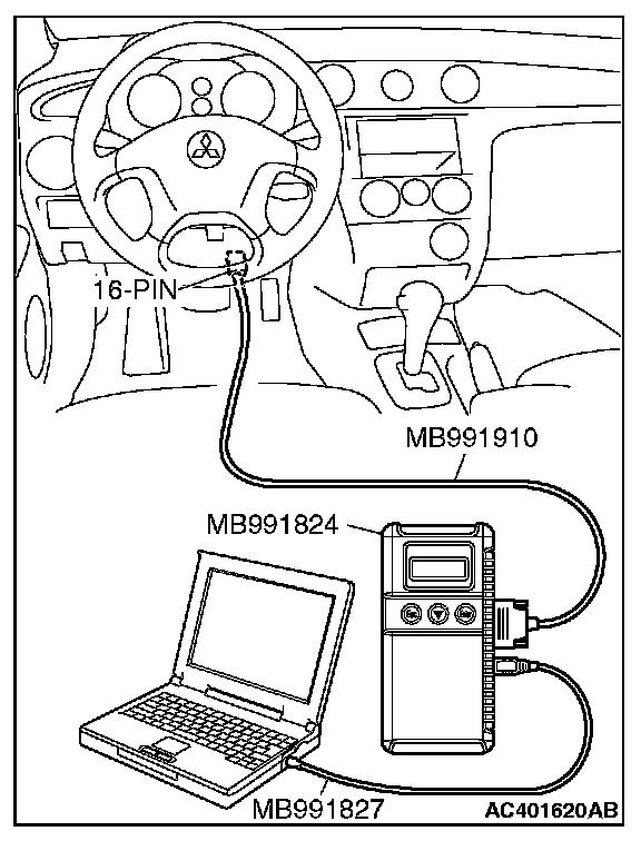 CAUTION: To prevent damage to scan tool MB991958, always turn the ignition switch to the "LOCK" (OFF) position before connecting or disconnecting scan tool MB991958.