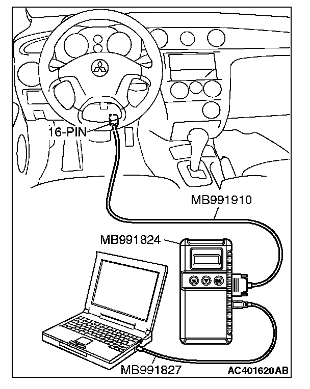 CAUTION: To prevent damage to scan tool MB991958, always turn the ignition switch to the "LOCK" (OFF) position before connecting or disconnecting scan tool MB991958.