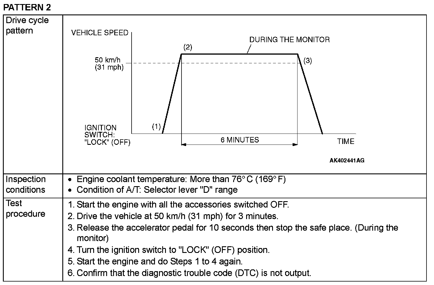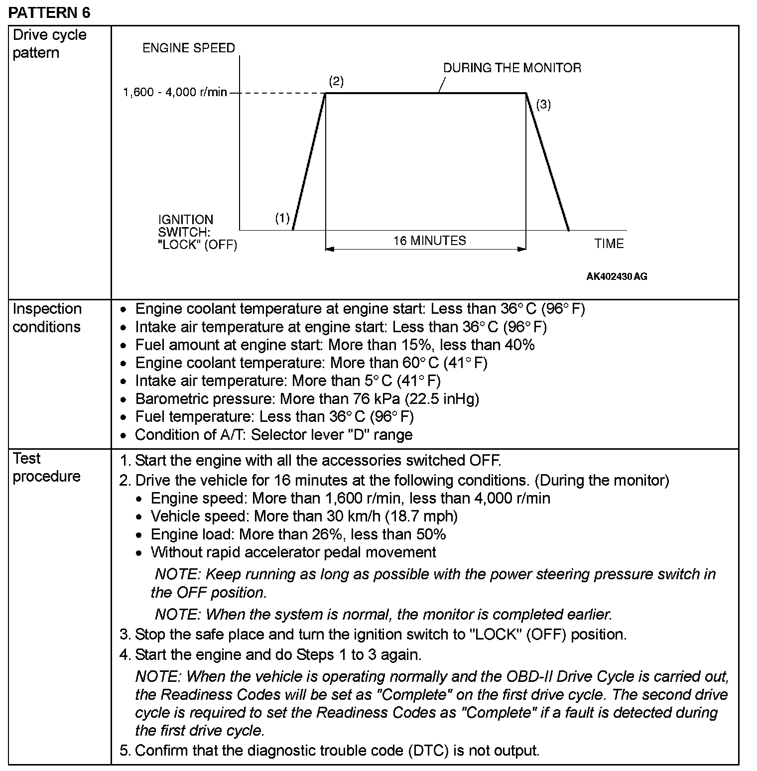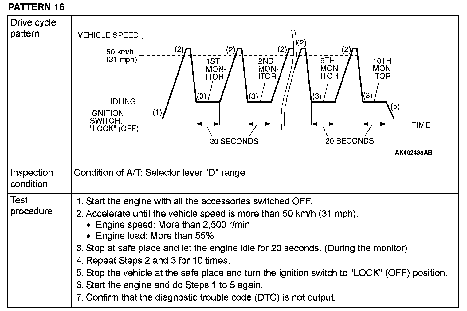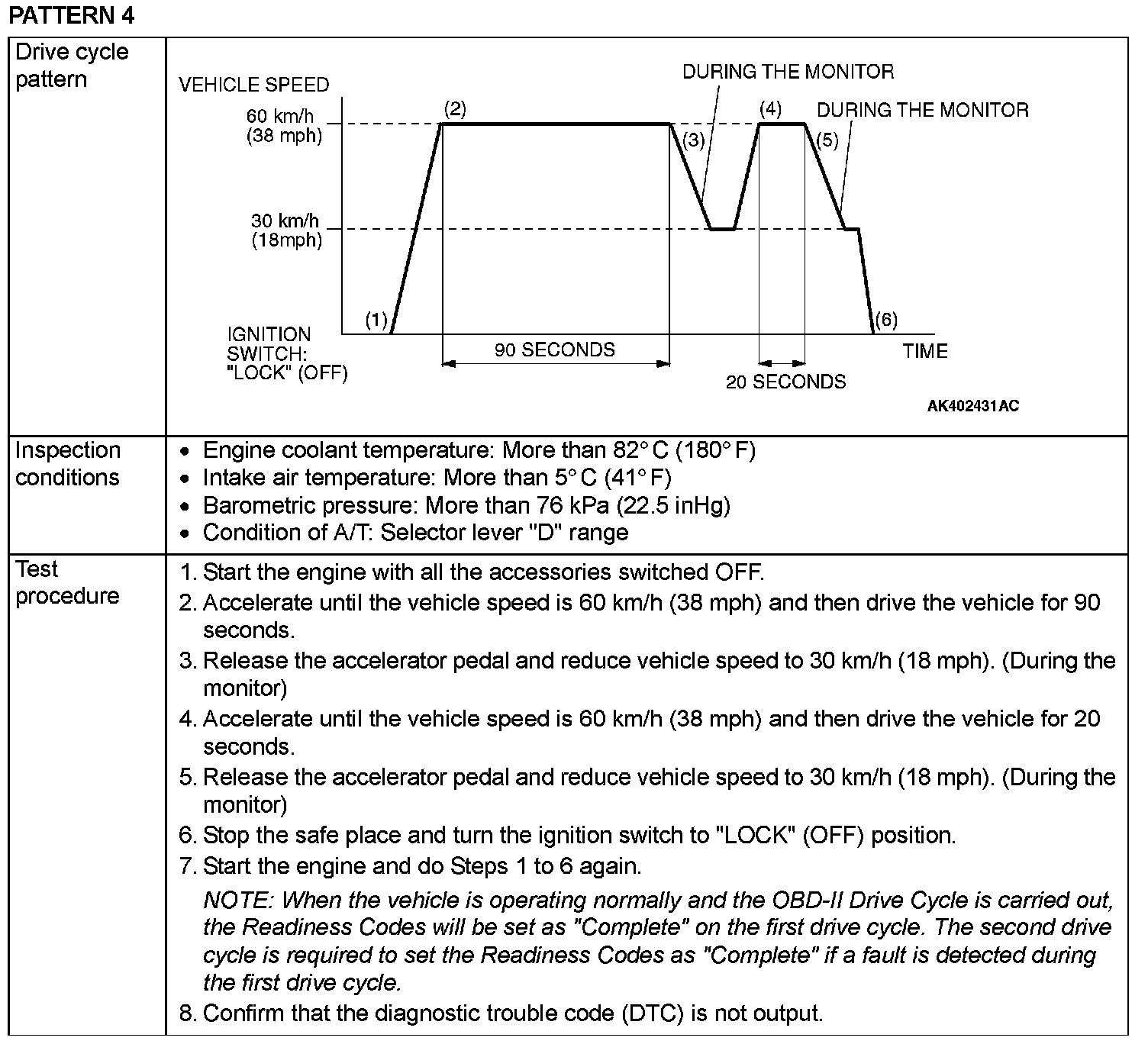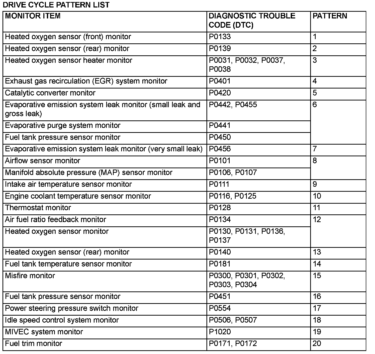 NOTE: Drive cycle patterns are not established for Vehicle speed sensor monitor (DTC P0500), Closed throttle position switch monitor (DTC P0510), Power steering pressure switch monitor (DTC P0551). Please reference the M.U.T. data list to judge whether these monitor items are normal.