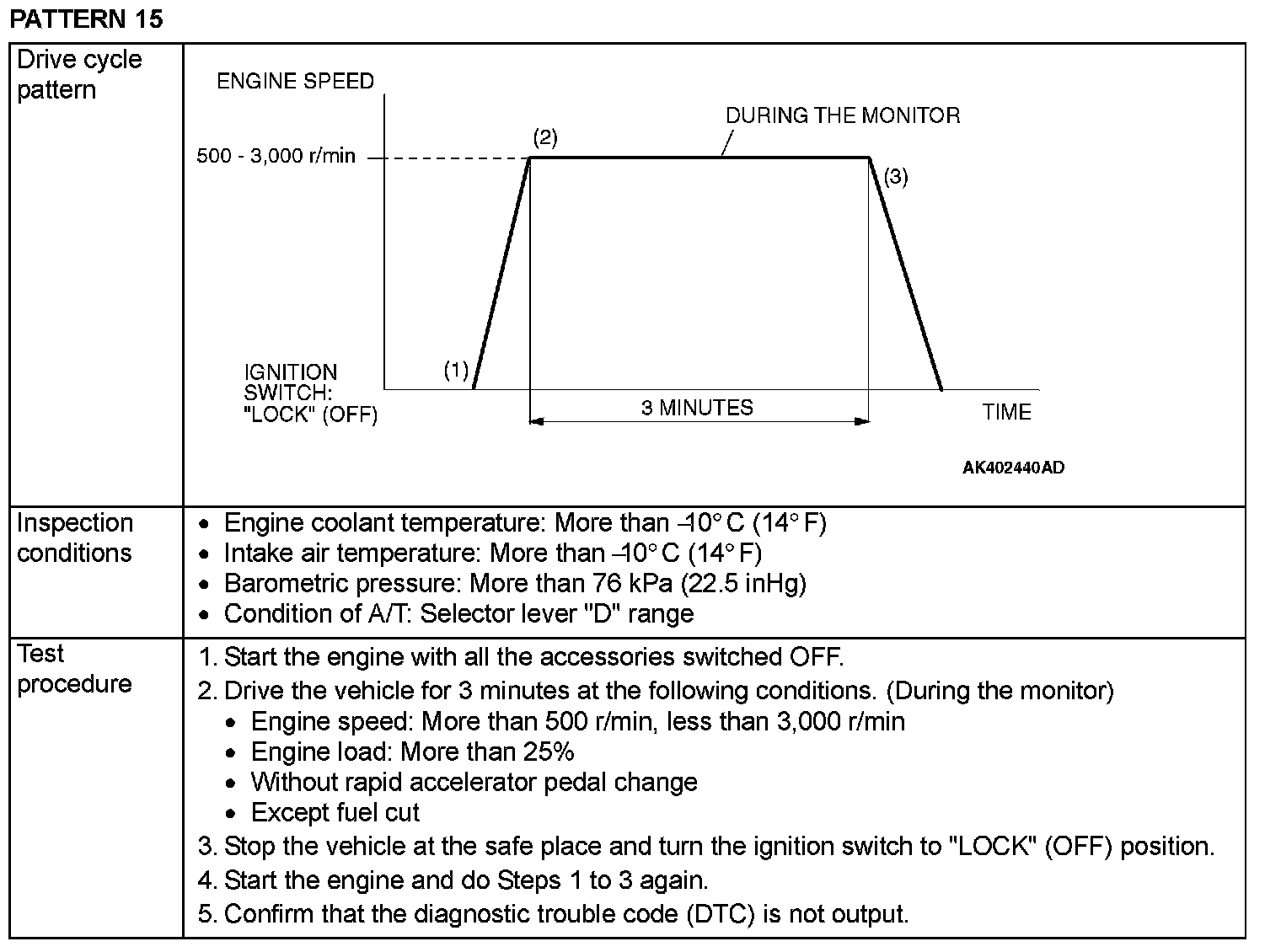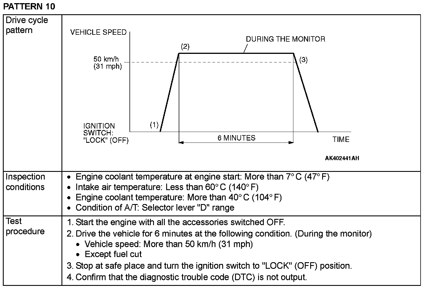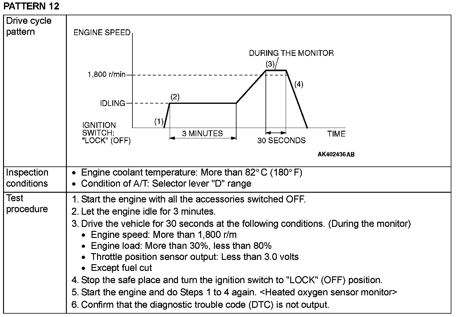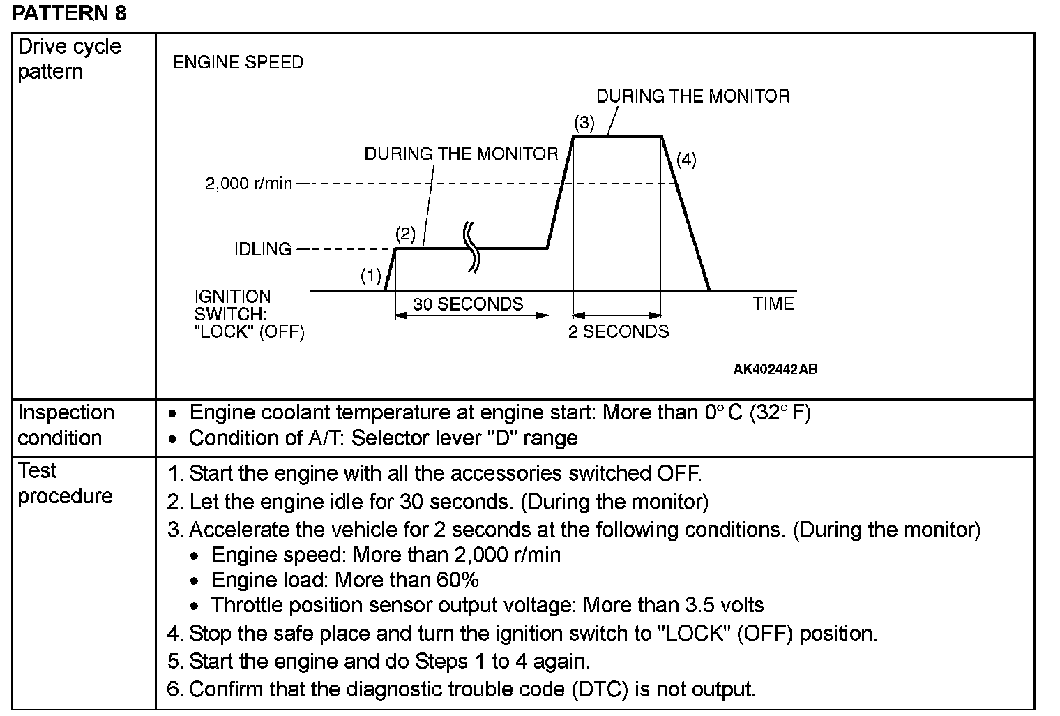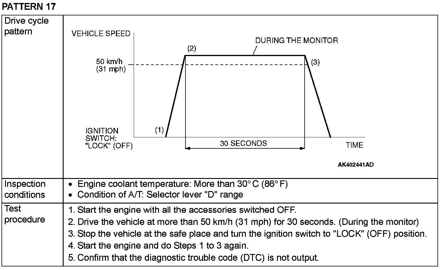 NOTE: Drive cycle patterns are not established for Vehicle speed sensor monitor (DTC P0500), Closed throttle position switch monitor (DTC P0510), Power steering pressure switch monitor (DTC P0551). Please reference the M.U.T. data list to judge whether these monitor items are normal.