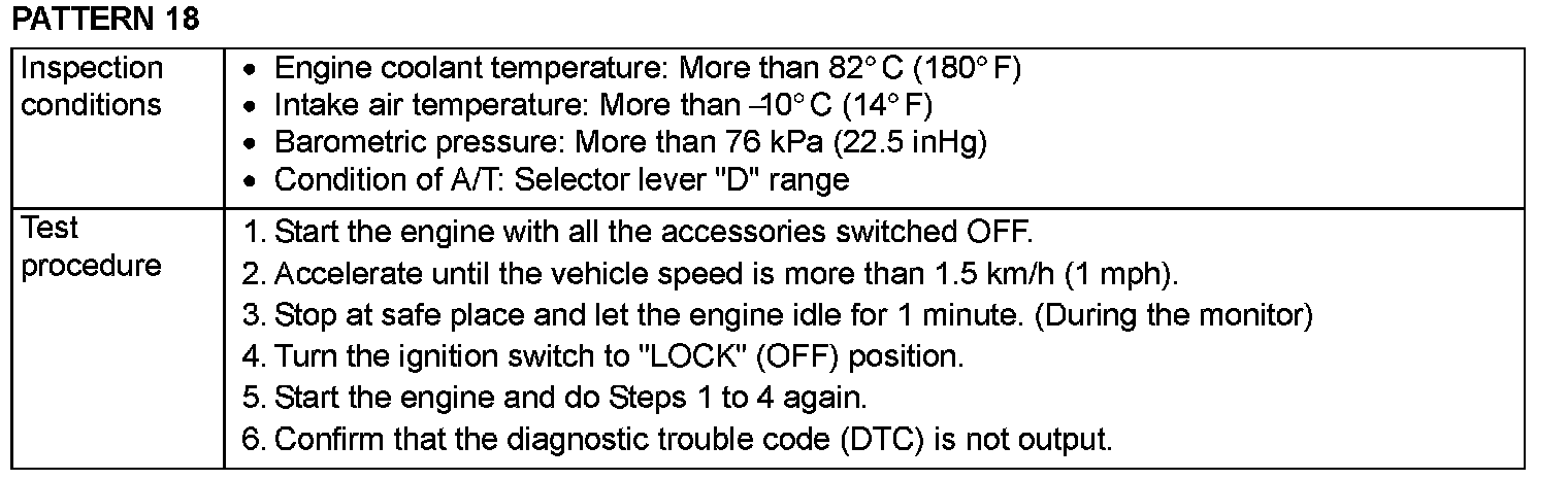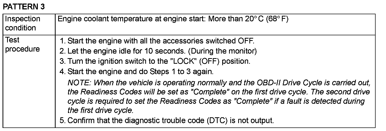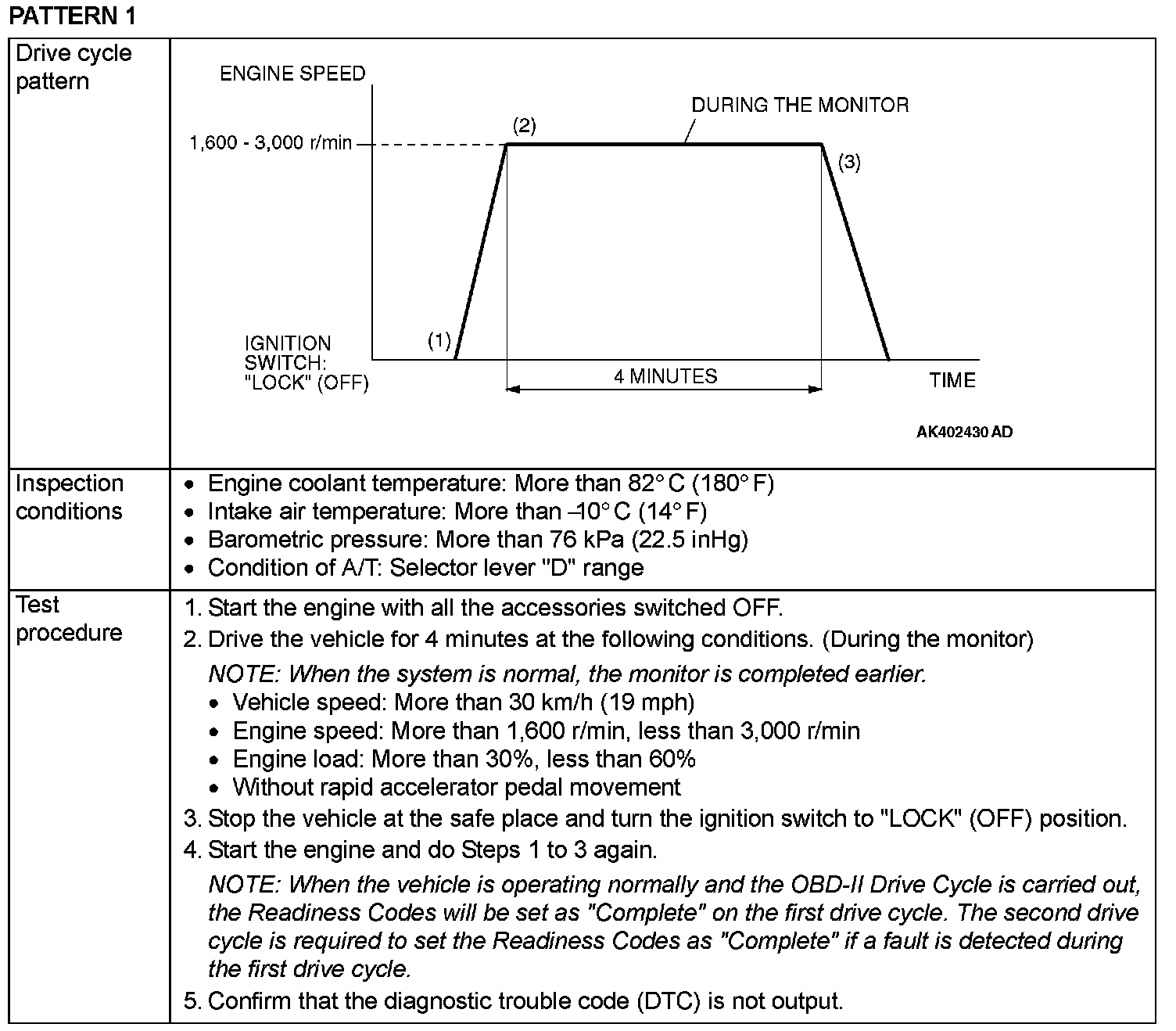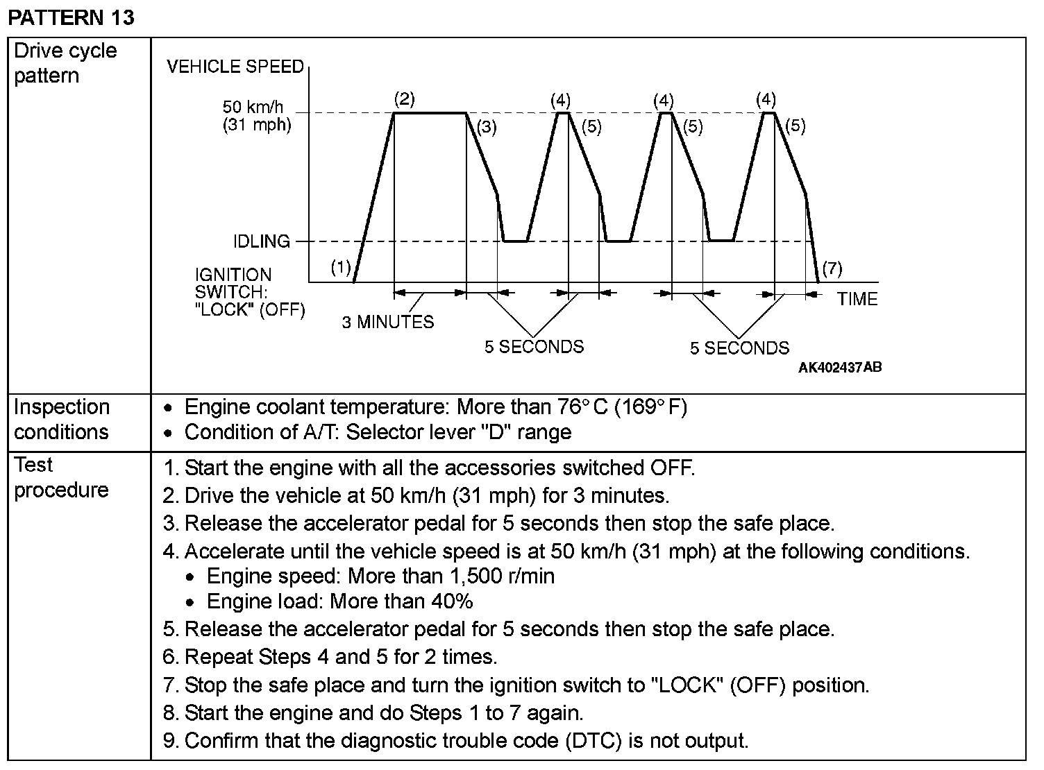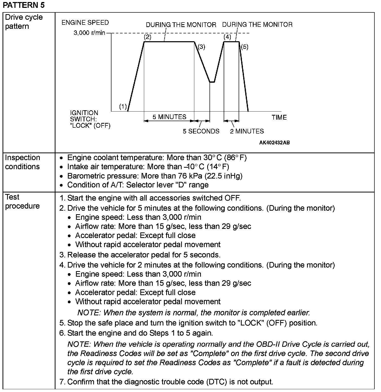 OBD- II DRIVE CYCLEDiagnostic trouble codes (DTCs) can be monitored by carrying out a short drive according to the following 22 drive cycle patterns. In other words, doing such a drive regenerates any kind of trouble which involves illuminating the Malfunction Indicator Lamp (SERVICE ENGINE SOON or Check Engine Lamp) and verifies the repair procedure has eliminated the trouble {the Malfunction Indicator Lamp (SERVICE ENGINE SOON or Check Engine Lamp) is no longer illuminated}.