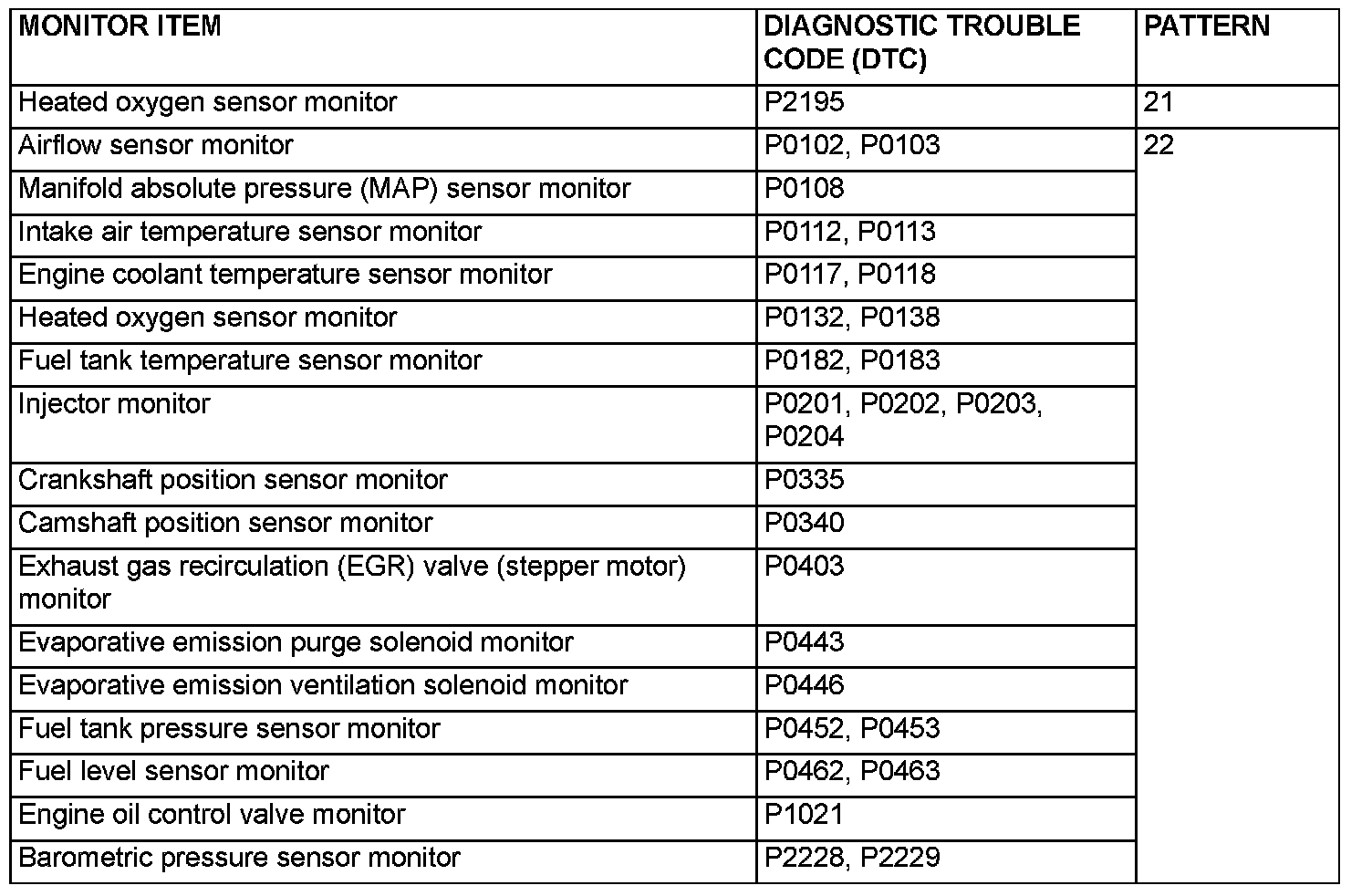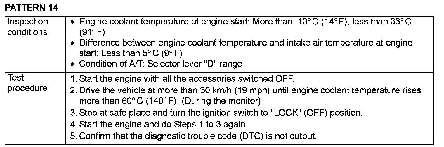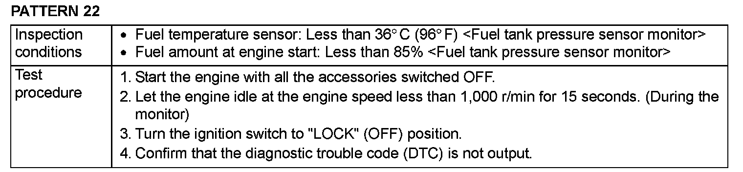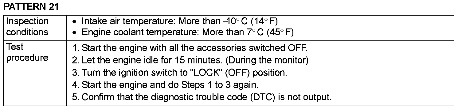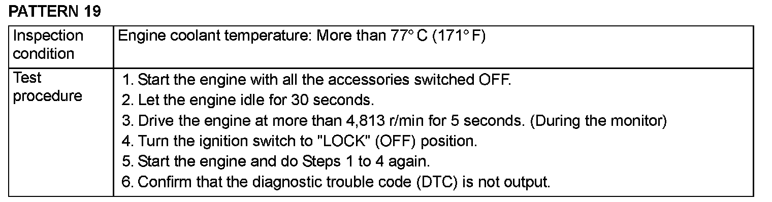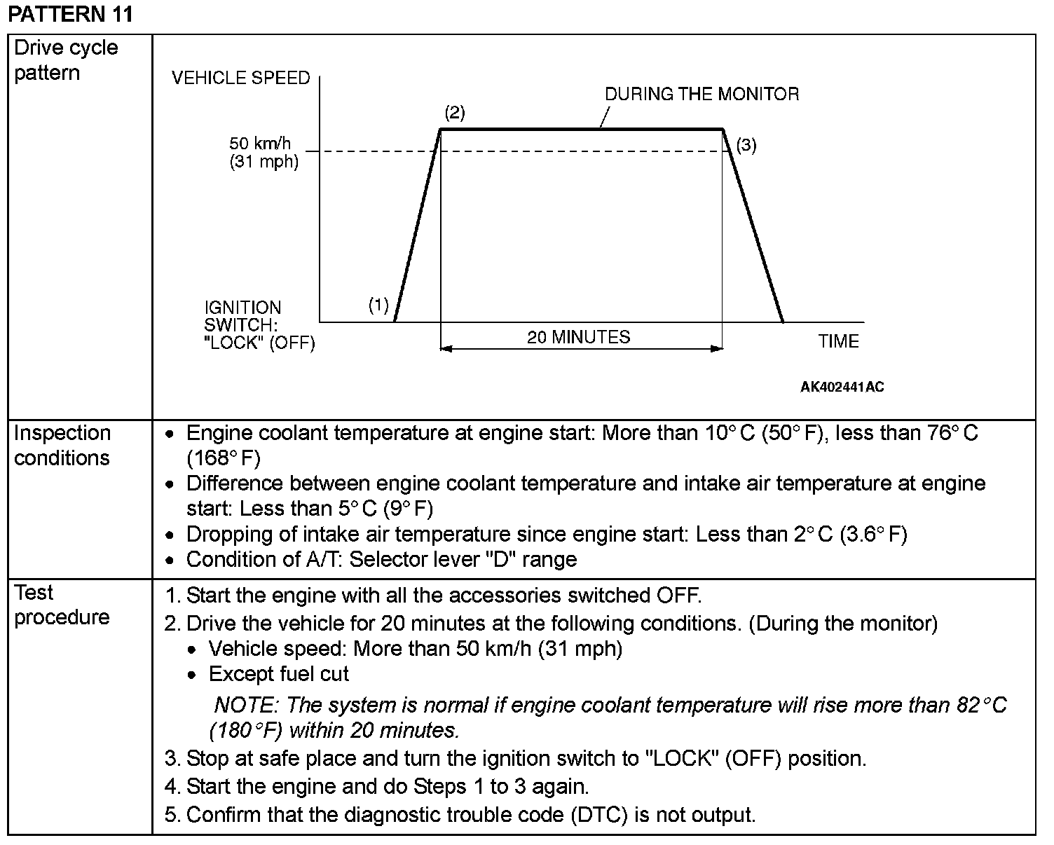 OBD- II DRIVE CYCLEDiagnostic trouble codes (DTCs) can be monitored by carrying out a short drive according to the following 22 drive cycle patterns. In other words, doing such a drive regenerates any kind of trouble which involves illuminating the Malfunction Indicator Lamp (SERVICE ENGINE SOON or Check Engine Lamp) and verifies the repair procedure has eliminated the trouble {the Malfunction Indicator Lamp (SERVICE ENGINE SOON or Check Engine Lamp) is no longer illuminated}.