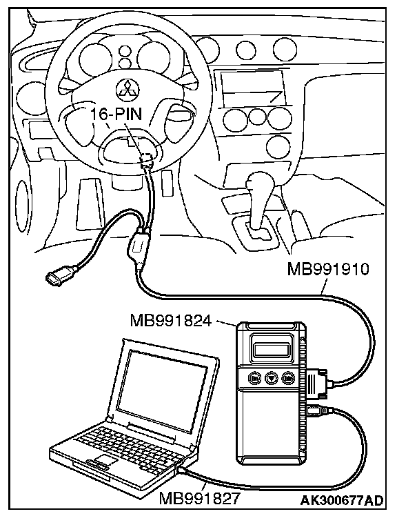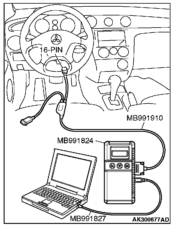 CAUTION: To prevent damage to scan tool MB991958, always turn the ignition switch to the "LOCK" (OFF) position before connecting or disconnecting scan tool MB991958.