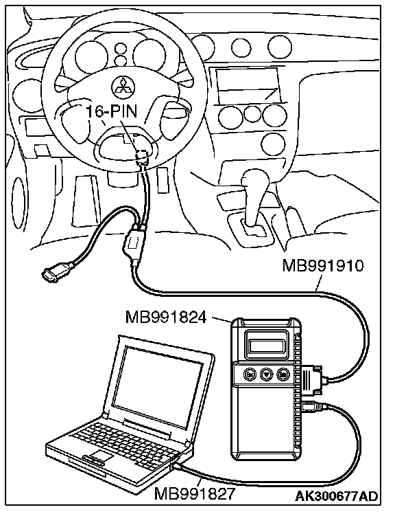 CAUTION: To prevent damage to scan tool MB991958, always turn the ignition switch to the "LOCK" (OFF) position before connecting or disconnecting scan tool MB991958.