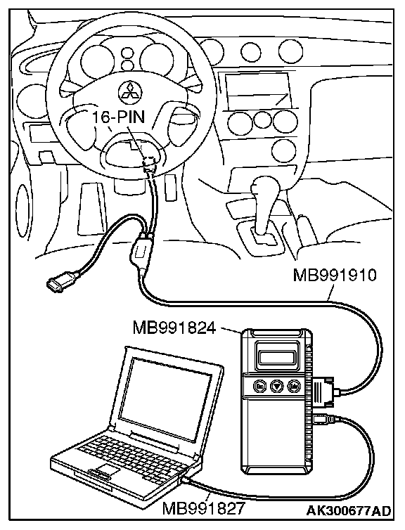 CAUTION: To prevent damage to scan tool MB991958, always turn the ignition switch to the "LOCK" (OFF) position before connecting or disconnecting scan tool MB991958.