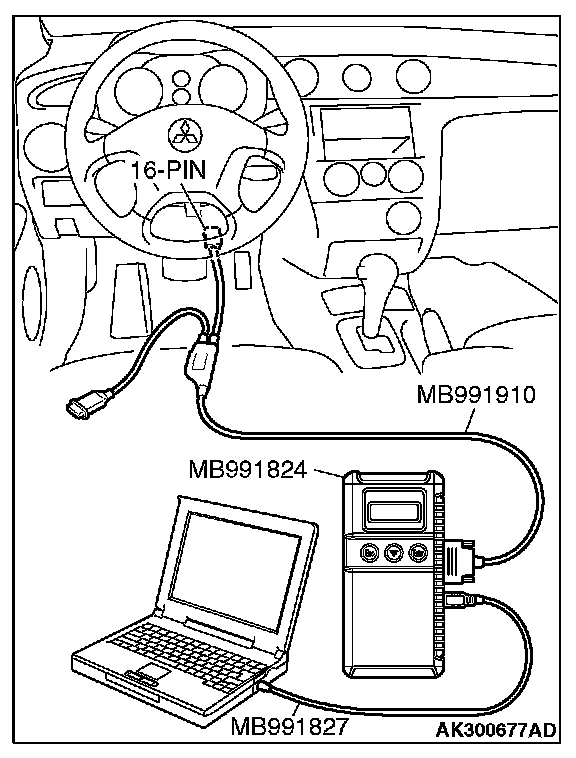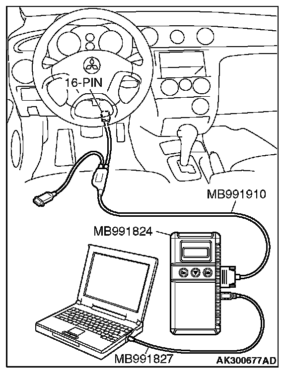 CAUTION: To prevent damage to scan tool MB991958, always turn the ignition switch to the "LOCK" (OFF) position before connecting or disconnecting scan tool MB991958.