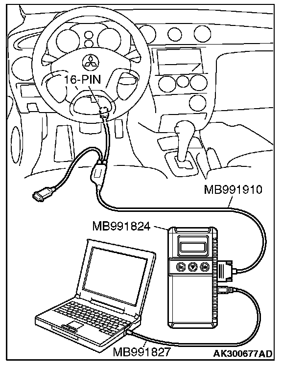 CAUTION: To prevent damage to scan tool MB991958, always turn the ignition switch to the "LOCK" (OFF) position before connecting or disconnecting scan tool MB991958.