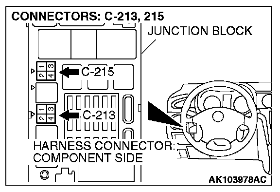 STEP 2. Check harness connector C-215 at fuel pump relay 1 and harness connector C-213 at fuel pump relay 2 for damage.
