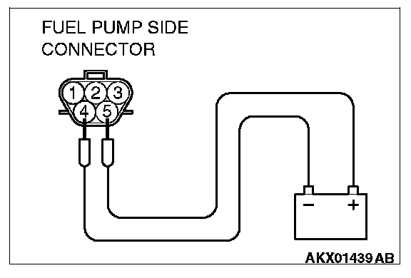 2. Use jumper wires to connect fuel pump connector terminal No. 5 to the positive battery terminal and terminal No. 4 to the negative battery terminal.