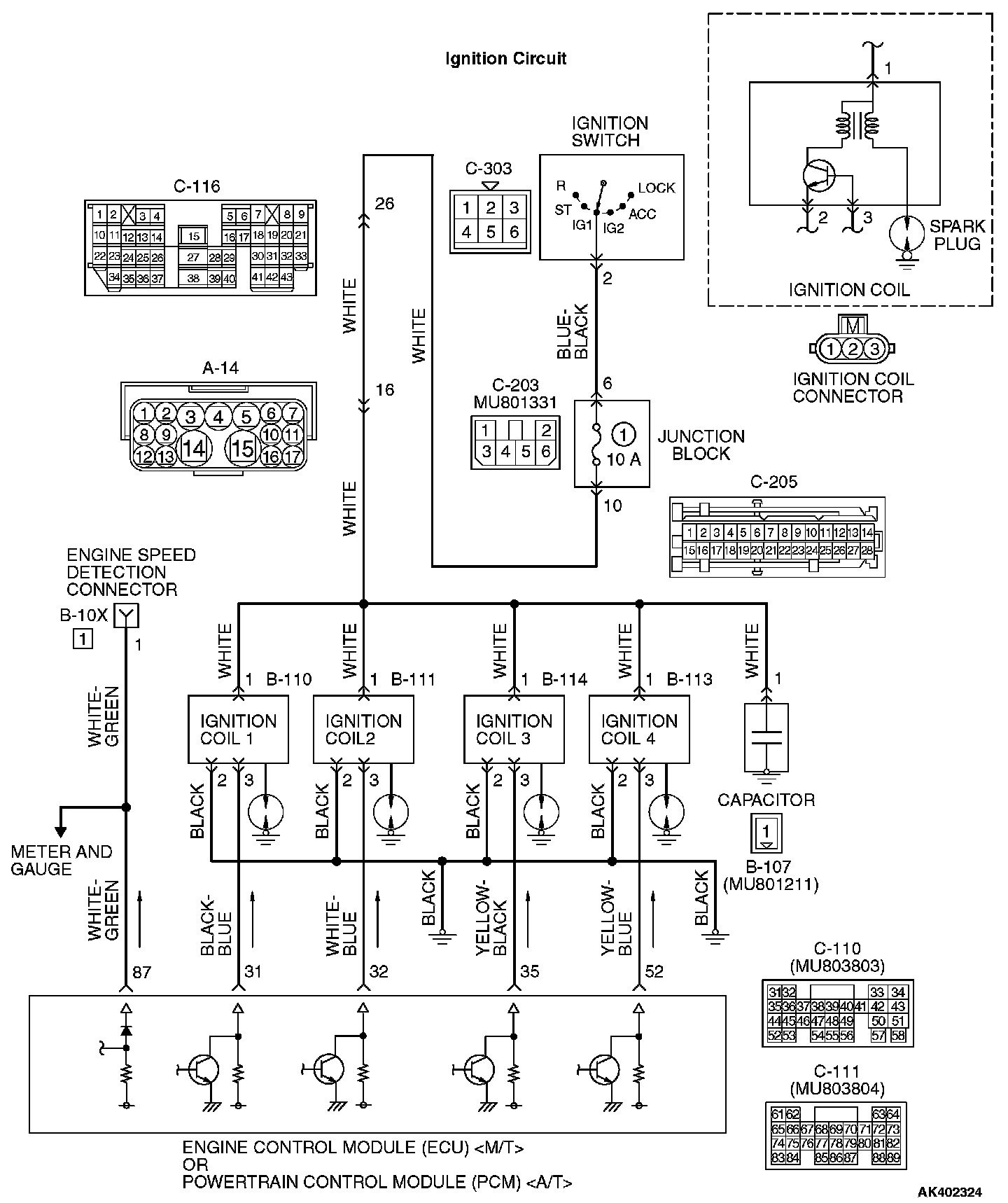 STEP 4. Check for open circuit between ignition switch connector C-303 (terminal No. 2) and ignition coil connectors B-110, B-111, B-113 and B-114 (terminal No. 1).