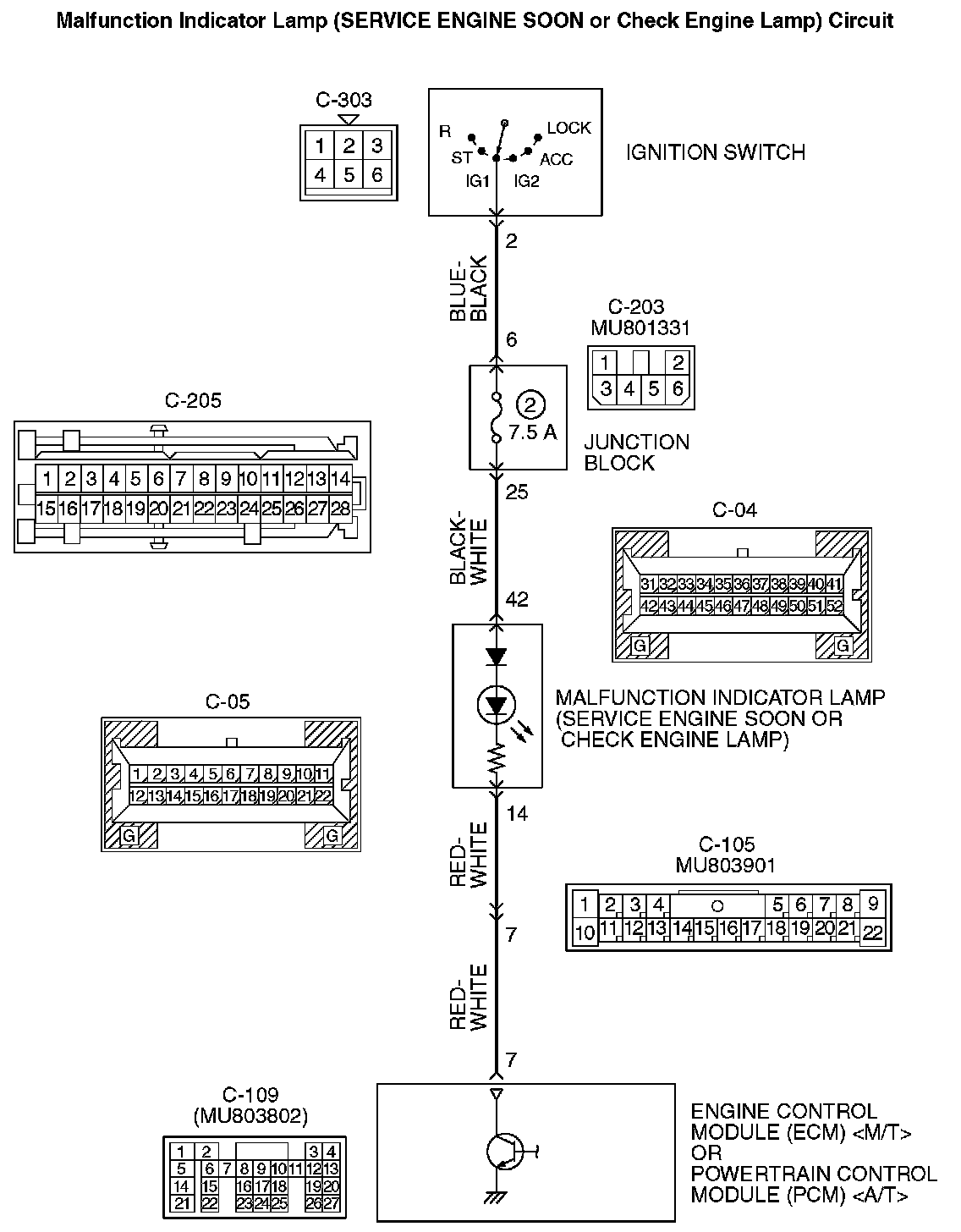 - Short-circuit between the malfunction indicator lamp (SERVICE ENGINE SOON or check engine lamp) and ECM