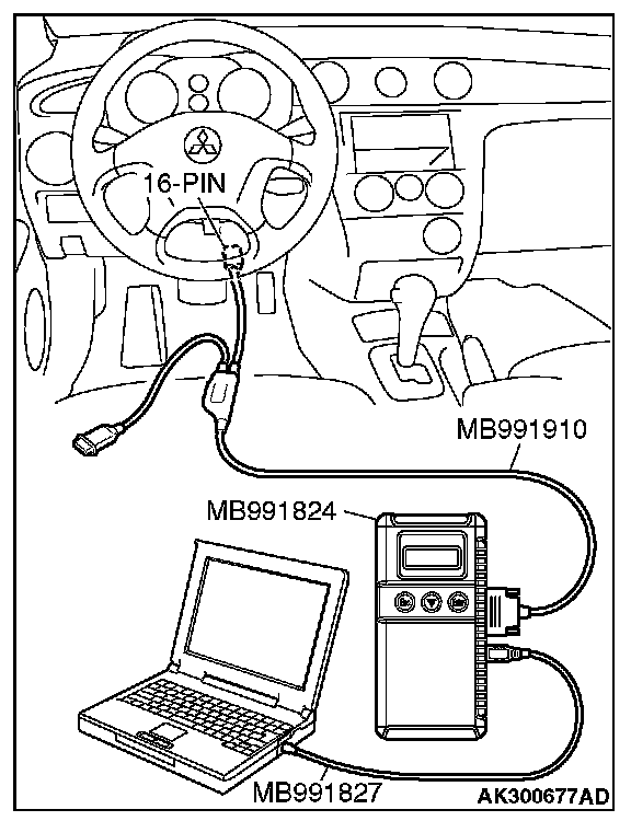 CAUTION: To prevent damage to scan tool MB991958, always turn the ignition switch to the "LOCK" (OFF) position before connecting or disconnecting scan tool MB991958.