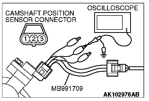 1. Disconnect the camshaft position sensor connector, and connect the test harness special tool (MB991709) between the separated connector. (All terminals should be connected.)