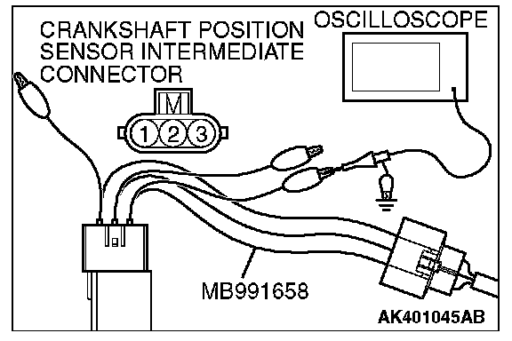 3. Disconnect the crankshaft position sensor intermediate connector, and connect the test harness special tool (MB991658) between the separated connector.