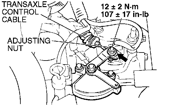 6. Gently push the transaxle control cable in the direction of the arrow, until the cable is taut. Tighten the adjusting nut.