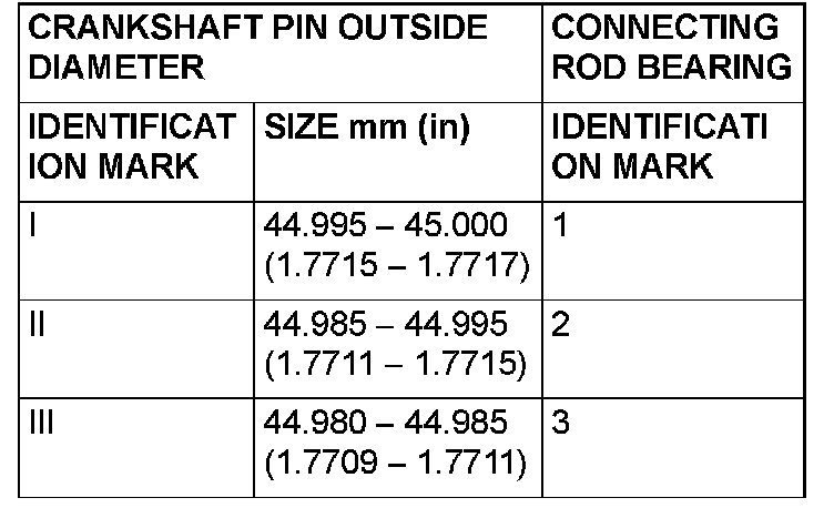 If the crankshaft pin outside diameter identification mark is "1", for example, select a bearing whose identification mark is "1 ". If there is no identification color paint on the crankshaft, measure the pin outside diameter and select a bearing appropriate for the measured value.