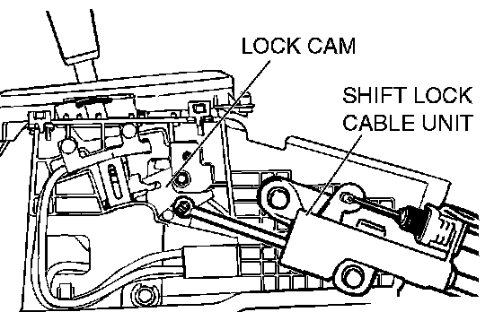 CAUTION: When removing and installing the shift lock cable unit, be careful not to hit the SRS-ECU.