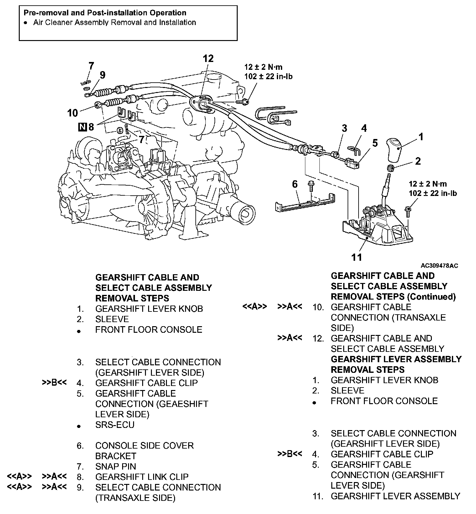 >>A<< GEARSHIFT CABLE AND SELECT CABLE ASSEMBLY/GEARSHIFT CABLE CONNECTION (TRANSAXLE SIDE) /SELECT CABLE CONNECTION (TRANSAXLE SIDE) /GEARSHIFT LINK CLIP INSTALLATION