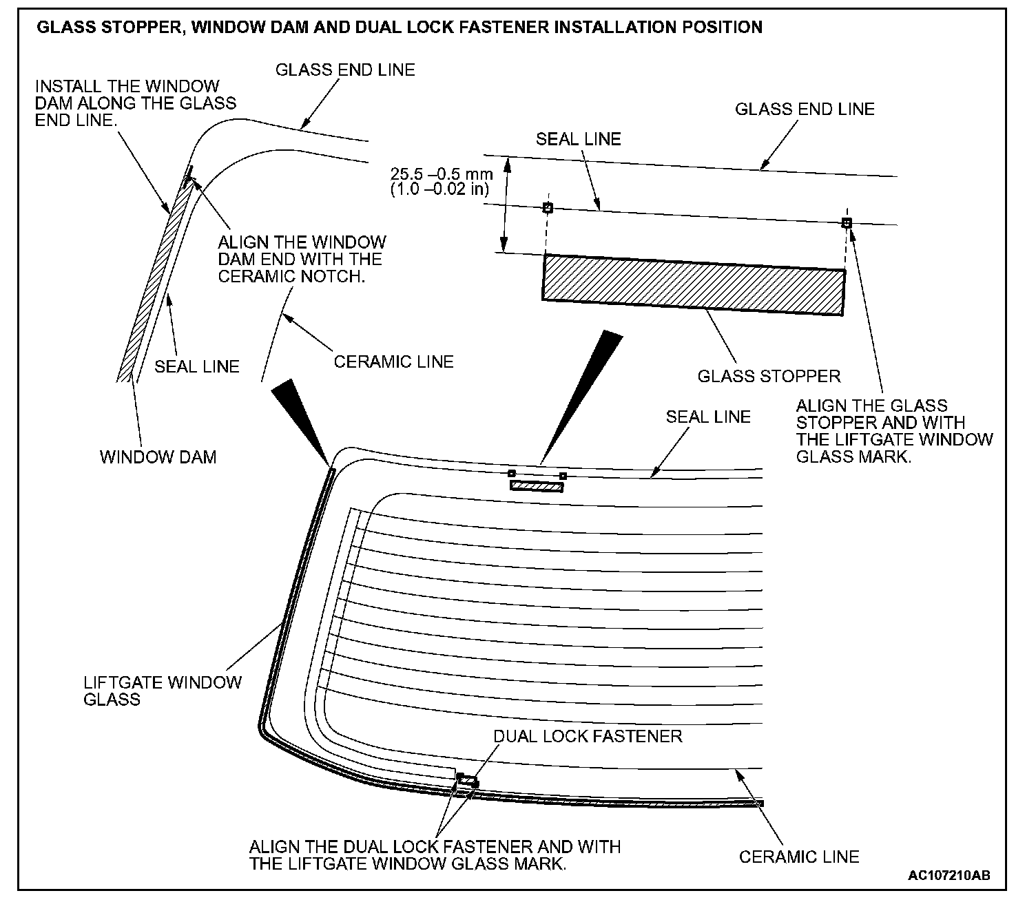 2. Assemble the window dam, glass stopper and dual lock fastener to the liftgate window glass location shown.