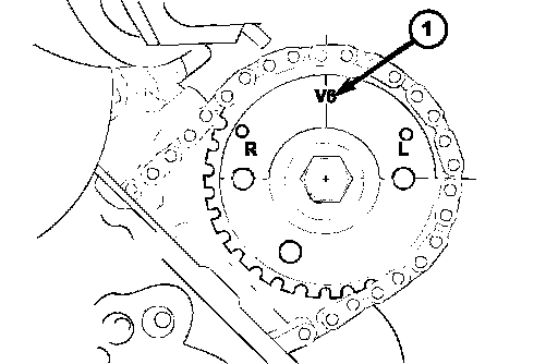 4. Re-index the camshaft drive gear in the chain until the V6 mark is at the same position as the V6 mark on the opposite camshaft drive gear.