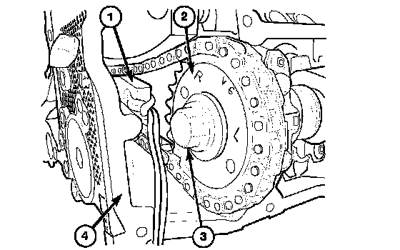 1. Using Chain Tensioner Wedge, Special Tool 8379 (2), stabilize the secondary chain drive (3). For reference purposes, mark the chain-to-sprocket position.