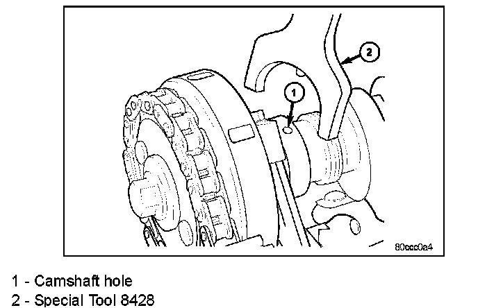 5. Using Special Tool 8428 Camshaft Wrench (2), rotate the camshaft until the alignment dowel on the camshaft is aligned with the slot in the camshaft drive gear.