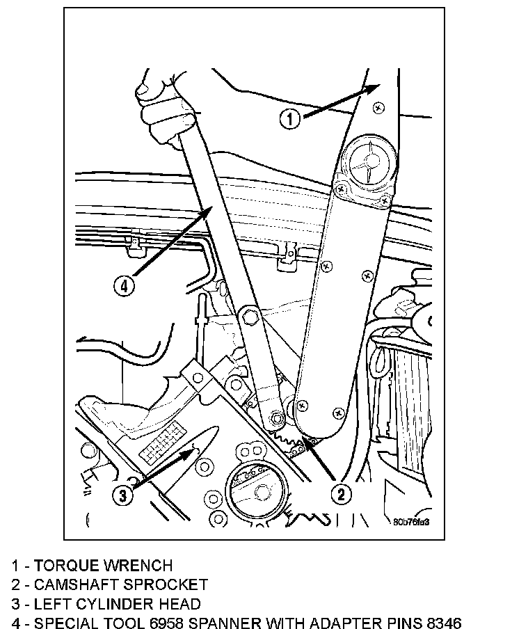 6. Position the camshaft drive gear onto the camshaft, remove oil from bolt then install the retaining bolt. Using Special Tools, Spanner Wrench 6958 with Adapter Pins 8346 (4) and a suitable torque wrench (1), tighten retaining bolt to 122 Nm (90 ft. Lbs.).