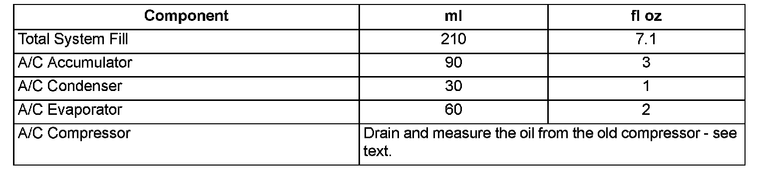 It will not be necessary to check the oil level in the A/ C compressor or to add oil, unless there has been an oil loss. An oil loss may occur due to a rupture or leak from a refrigerant line, a connector fitting, a component, or a component seal. If a leak occurs, add 30 milliliters (1 fluid ounce) of refrigerant oil to the refrigerant system after the repair has been made. Refrigerant oil loss will be evident at the leak point by the presence of a wet, shiny surface around the leak. Refrigerant oil must be added when an A/C accumulator, A/C condenser or an A/C evaporator is replaced. See the Refrigerant Oil Capacities chart. When an A/C compressor is replaced, the refrigerant oil must be drained from the old compressor and measured. Drain all of the refrigerant oil from the new A/C compressor, then fill the new compressor with the same amount of refrigerant oil that was drained out of the old compressor.
