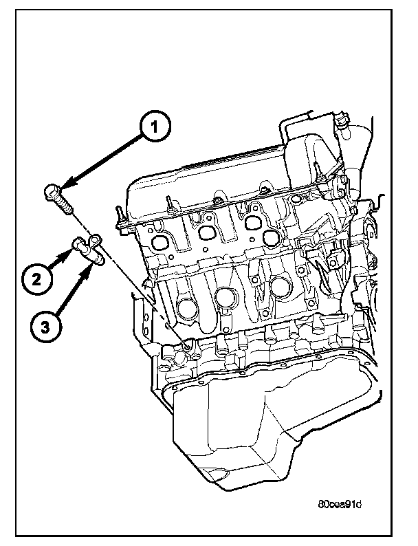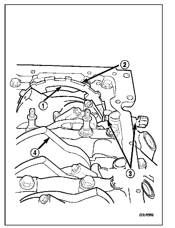 The Crankshaft Position (CKP) sensor (2) is mounted into the right rear side of the cylinder block. It is positioned and bolted into a machined hole.