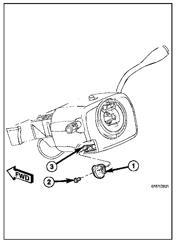 2. Remove the screw (2) that secures the tilt steering column knob (1) and remove it from the tilt actuator (3) on the left side of the column.
