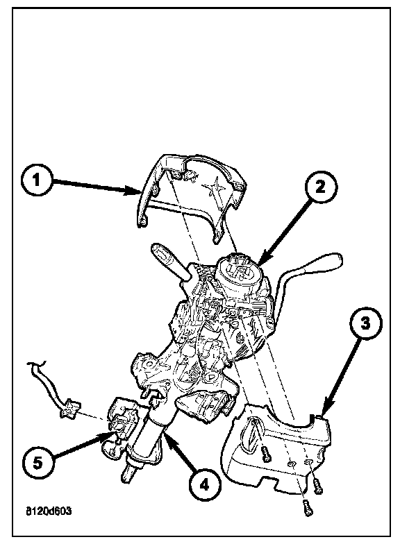 3. From below the steering column, remove the two outboard screws that secure the upper column shroud (1) to the lower shroud (3).