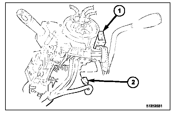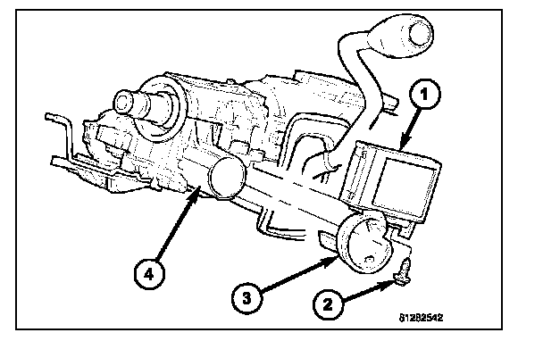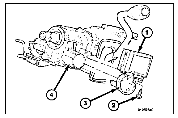 1. Position the Sentry Key REmote Entry Module (SKREEM) (1) onto the steering column with the antenna ring (3) oriented around the ignition lock cylinder housing (4).