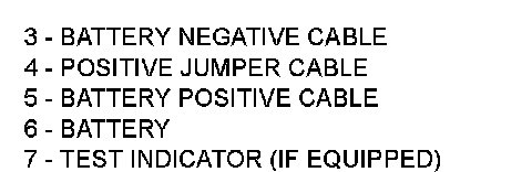 4. Connect jumper cables to booster battery. RED clamp (4) to positive terminal (+). BLACK clamp (2) to negative (3) terminal (-). DO NOT allow clamps at opposite end of cables to touch, electrical arc will result. Review all warnings in this procedure.