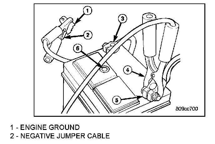 7. Allow battery in disabled vehicle to charge to at least 12.4 volts (75% charge) before attempting to start engine. If engine does not start within 15 seconds, stop cranking engine and allow starter to cool (15 min.), before cranking again.