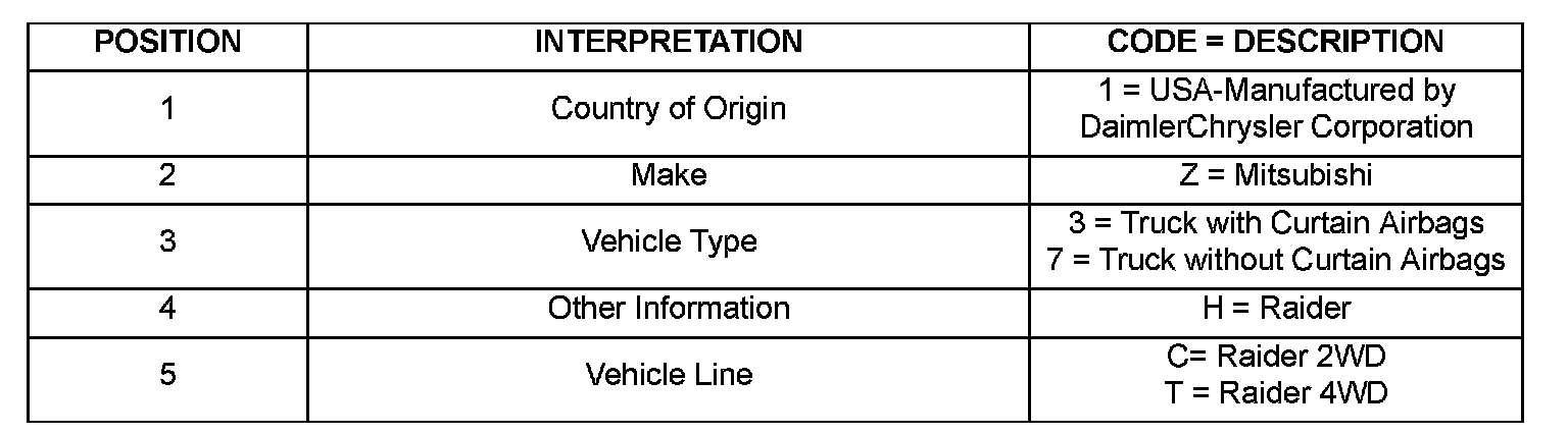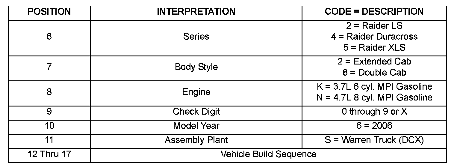 VEHICLE IDENTIFICATION NUMBERThe Vehicle Identification Number (VIN) plate is attached to the top left side of the instrument panel The VIN contains 17 characters that provide data concerning the vehicle. Refer to the decoding chart to determine the identification of a vehicle. To protect the consumer from theft and possible fraud the manufacturer is required to include a Check Digit at the ninth position of the Vehicle Identification Number. The check digit is used by the manufacturer and government agencies to verify the authenticity of the vehicle and official documentation. The formula to use the check digit is not released to the general public.
