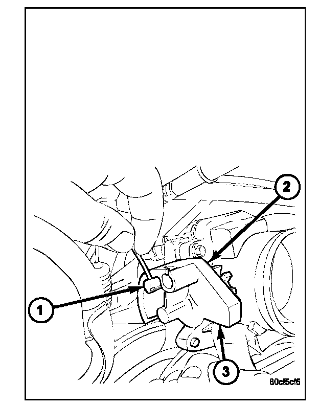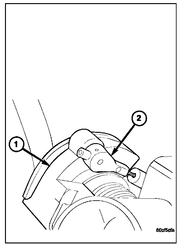 5. Using finger pressure only, disconnect servo cable connector (2) at throttle body bellcrank pin by pushing connector off bellcrank pin towards front of vehicle. DO NOT try to pull connector off perpendicular to the bellcrank pin. Connector will be broken.