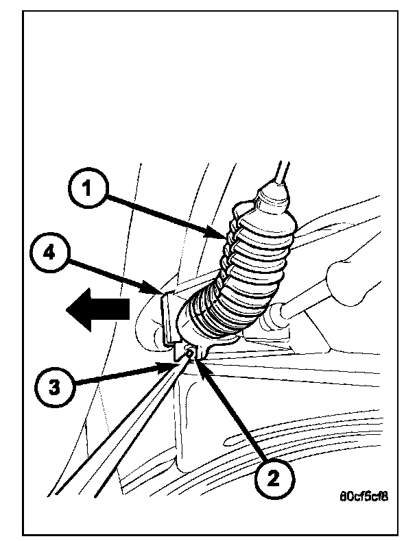 4. Using a pick or small screwdriver, press release tab (2) to release plastic cable mount from bracket. Press on tab only enough to release cable from bracket. If tab is pressed too much, it will be broken. Slide plastic mount (4) to remove throttle cable from throttle body bracket.