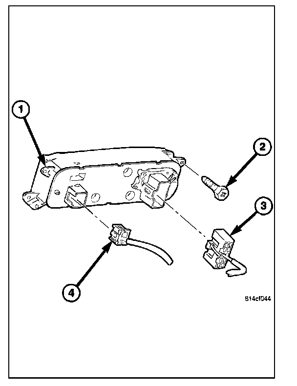 2. Remove the center bezel from the instrument panel and disconnect the wire harness connectors (3 and 4) from the A/C-heater control (1).