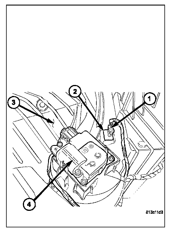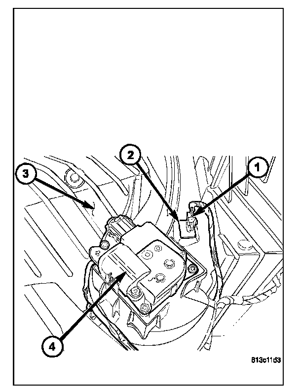 1. Install the evaporator temperature sensor (2) into the opening in the HVAC housing (3) near the blend door actuator (4).