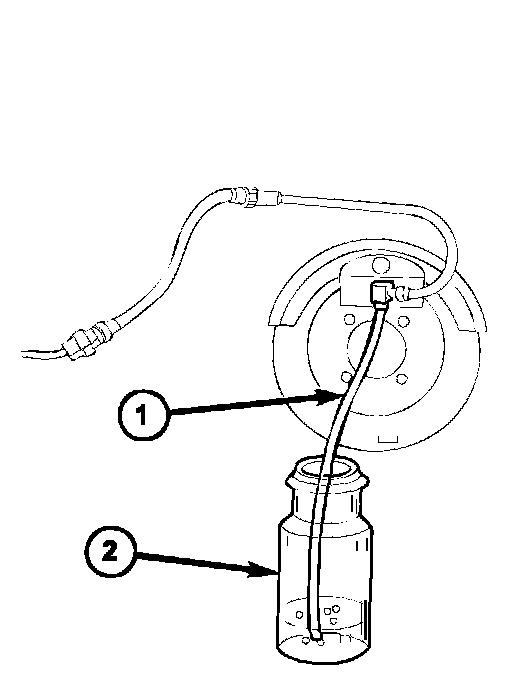 3. Attach one end of bleed hose (1) to bleed screw and insert opposite end in glass container (2) partially filled with brake fluid. Be sure end of bleed hose is immersed in fluid.