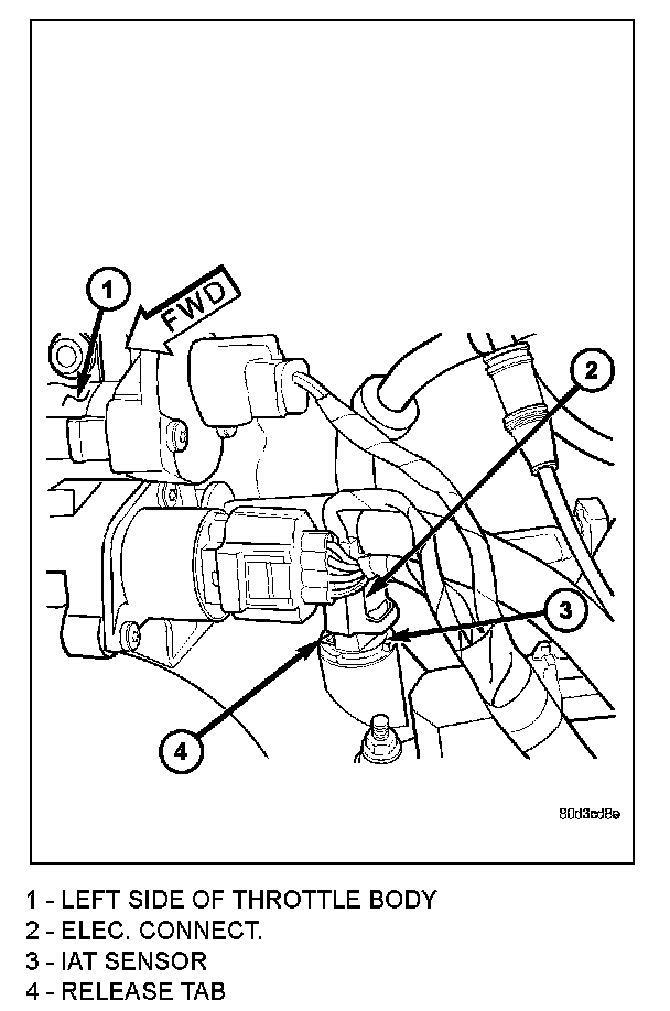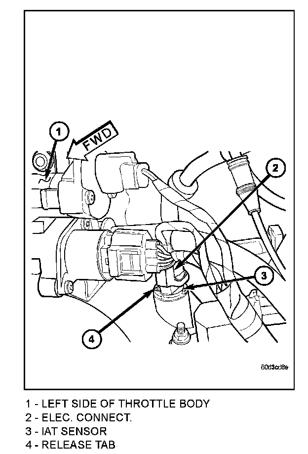 The intake manifold air temperature (IAT) sensor (3) is installed into the left side of intake manifold plenum.