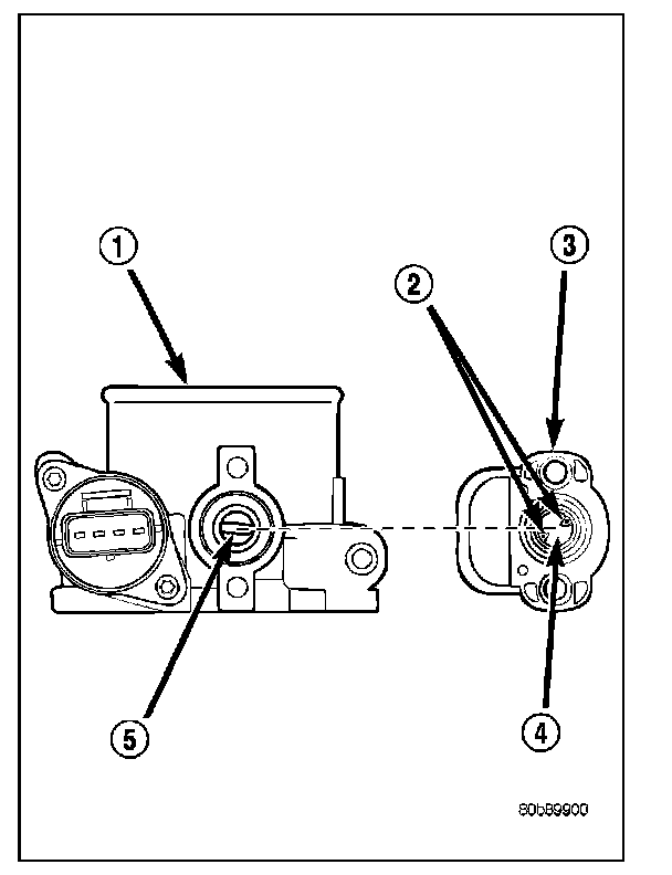 The throttle shaft end of throttle body (5) slides into a socket in TPS (4). The TPS must be installed so that it can be rotated a few degrees. If sensor will not rotate, install sensor with throttle shaft on other side of socket tangs. The TPS will be under slight tension when rotated.