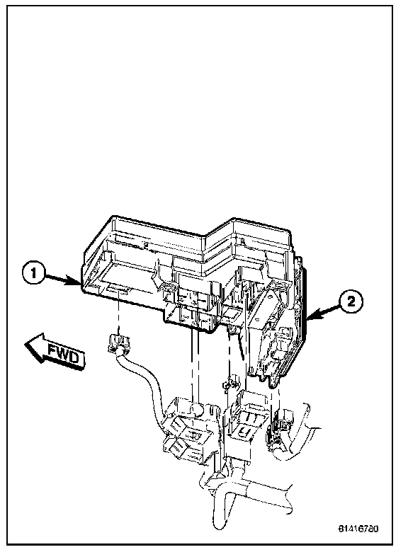 The Front Control Module (FCM) (2) is a micro controller based module located in the left front corner of the engine compartment. The FCM mates to the Power Distribution Center (PDC) (1) to form the Integrated Power Module (IPM). The IPM connects directly to the battery and provides the primary means of circuit protection and power distribution for all vehicle electrical systems. The front control module controls power to some of these vehicle systems electrical and electromechanical loads based on inputs received from hard wired switch inputs and data received on the Controller Area Network (CAN) bus circuit.