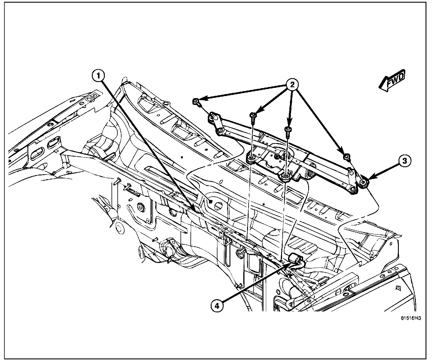5. Remove the four screws (2) that secure the wiper module (3) to the cowl plenum panel.