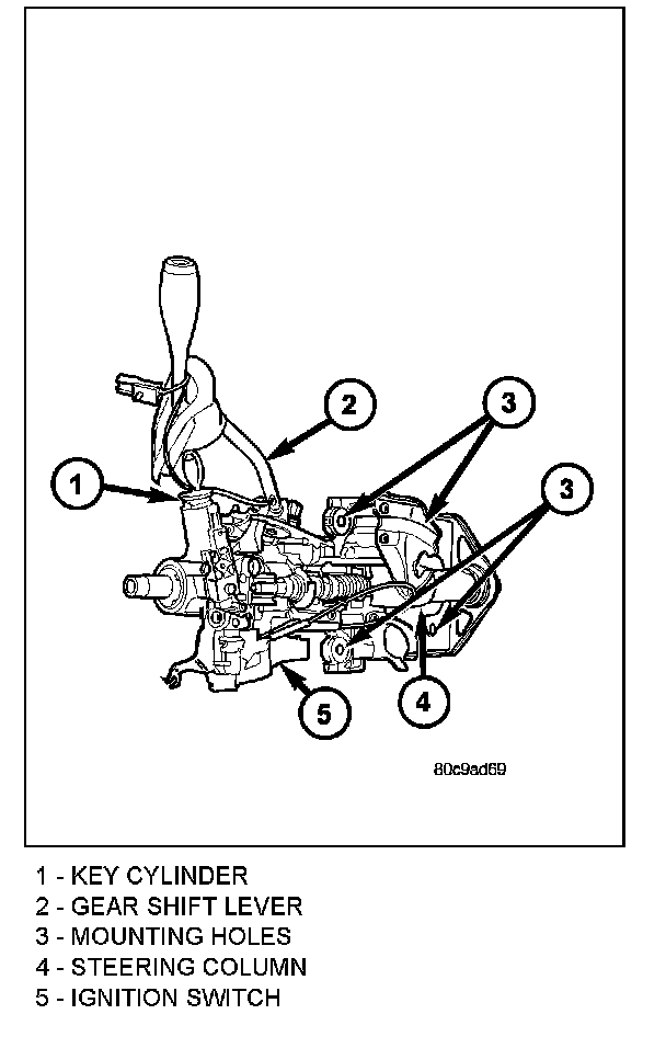 The ignition switch (5) is located on the steering column (4). It is used as the main on/off switching device for most electrical components. The mechanical key cylinder is used to engage/disengage the electrical ignition switch.