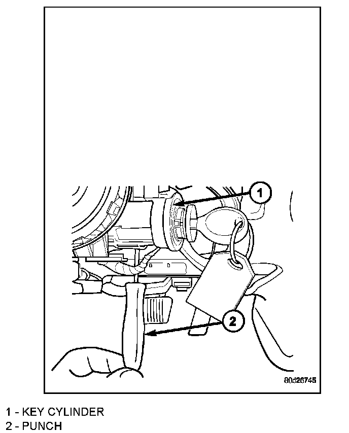 The ignition key (1) must be in the key cylinder (2) for cylinder removal.
